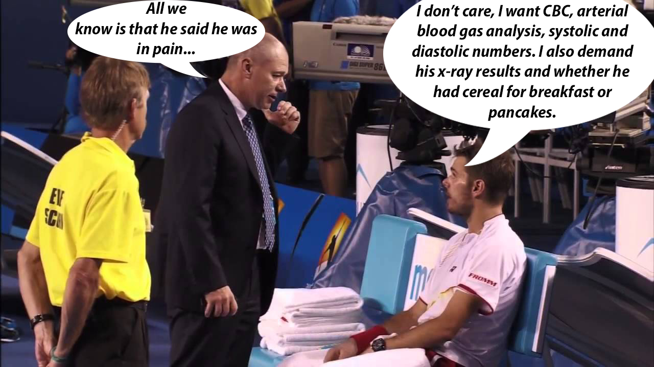 So, the quarter-finals are ahead of you. Before you step on court may I suggest you do so fully prepared with last year’s final between Rafaello and Stanford firmly in mind. You’ll remember Stanford being rather insistent on being made aware of Rafaello’s medical issues, in minute detail. Therefore, if you have any pre-existing physical problems that may cause issues during the match please ensure you satisfy any queries Stanford may have. I recommend a medical certificate for each problem. All documents must be signed by three Doctors and also must be accompanied with 2 x-rays and 3 MRI scans and a partridge in a pear tree. If you are taking any medication it may be a good idea to list the date of prescription and also be prepared to give Stanford the telephone number of the Doctor that supplied these for Stanford’s verification.